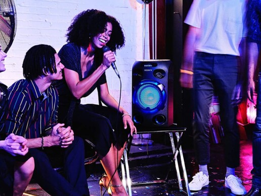 The MHC-V02 has built-in carry handles so you can take it to a friend’s house or easily move the party between rooms.